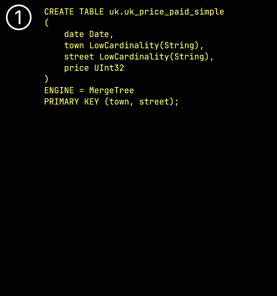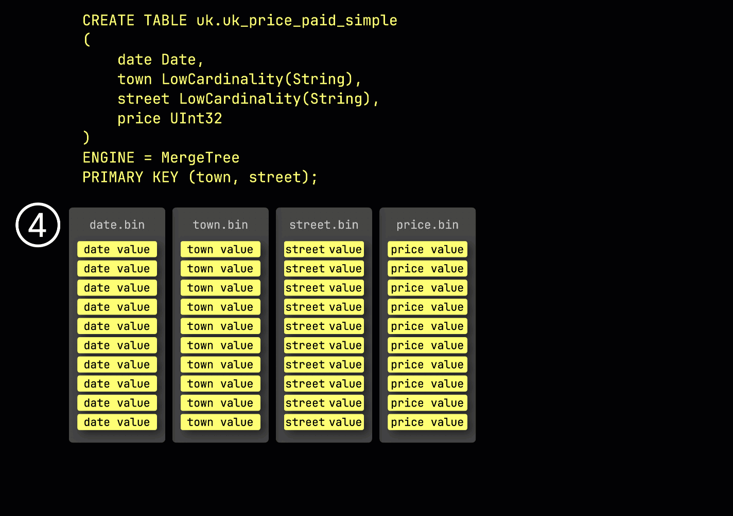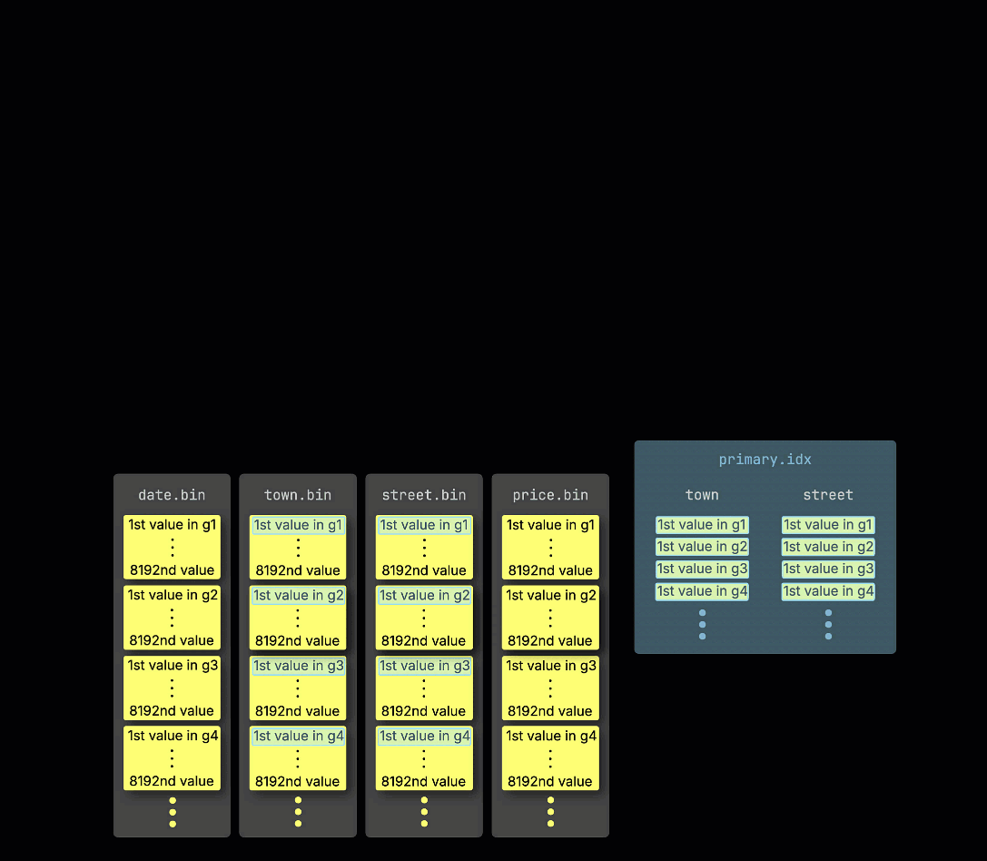 As a reminder, in our ① example table with the ^^primary key^^ (town, street), ② inserted data is ③ stored on disk, sorted by the ^^primary key^^ column values, and compressed, in separate files for each column: